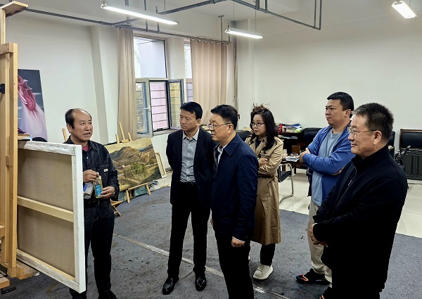 在美术工作室,调研组观看了宁夏美协副主席、宁夏美协油画艺委会主任、银川市文化艺术馆创研员王心悟的油画作品,并听取了相关工作汇报。随后围绕如何更好地运用油画形式展现新时代中国特色社会主义发展新成就、积极拓宽对外交流渠道、增强宁夏美术事业影响力等方面展开了深入交流。