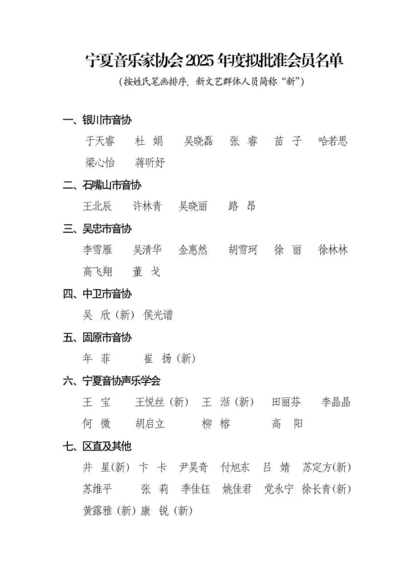 2025年度宁夏音乐家协会入会申报审批工作已经结束。协会共收到各团体会员等单位推荐的54名申报者材料。依据《宁夏音乐家协会发展会员标准细则》,经初审、复核等程序严格审核,并提交宁夏音乐家协会第八届主席团第六次(扩大)会议审议通过,拟定47名申报者为2025年度新会员。现将名单予以公示。